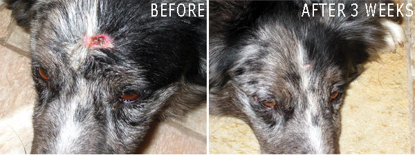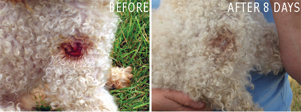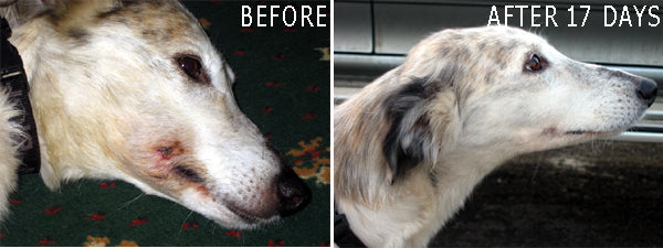 Before and after photos for Petnat Ultrasalve first-aid ointment for dogs.